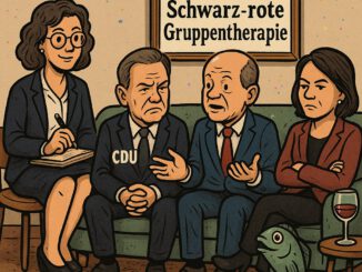 – Union & SPD in Gruppentherapie: Stuhlkreis statt Koalition– Therapeutin: „Wie Ehepaar nach 30 Jahren – keiner verkauft das Haus“– Sumpfisch-Beitrag: „Wasser ist nass“ – […]