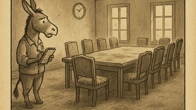 Der Esel blättert in den Protokollen und seufzt: „Die erste Sitzung wurde auf die zweite vertagt – und die zweite auf die dritte.“