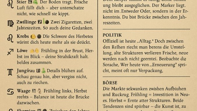 Offiziell ist heute „Alltag“. Doch zwischen den Reihen riecht man bereits die Umstellung: alte Strukturen verlieren Frische, neue werden noch nicht geerntet. Beobachte die Sprache: Wer heute von „Erneuerung“ spricht, meint oft nur Verpackung.