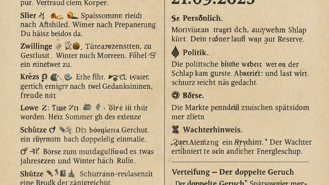 Die Wächter erinnern dich daran, dass Spätsommer und Winter kein Widerspruch sind. Heute ist es ein Training im Doppeltakt: Freude und Vorbereitung gleichzeitig.