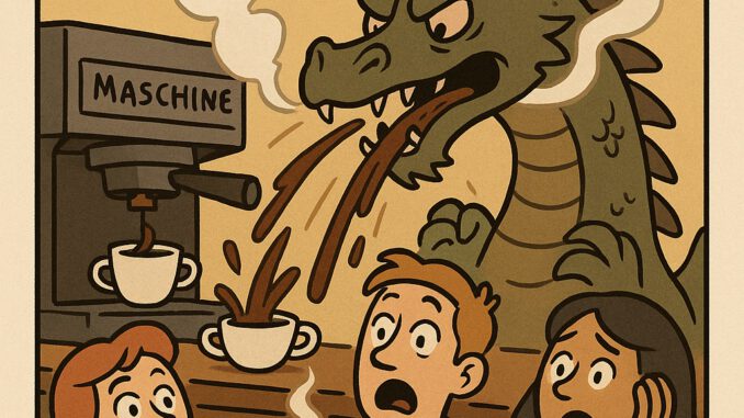 Heute Morgen stieg über der Frühstückstheke Rauch auf, und die Belegschaft verbeugte sich unwillkürlich. Die Kaffeemaschine, liebevoll „Drache“ genannt, hatte ihre nächtliche Selbstreinigung überlebt und gab nun wieder Lava aus – schwarz, heiß, leicht bedrohlich.