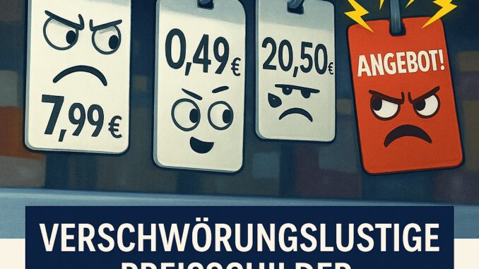Preisschilder verschwören sich: Plätze tauschen, Nullen anhängen, „Angebot!“ blinken ohne Rabatt. Trickster: „99 Cent – ältester Witz.“