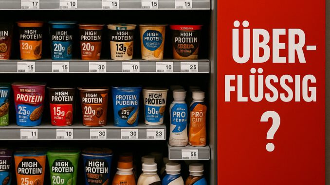 High-Protein-Produkte: nicht überlebenswichtig, aber praktisch. Sättigen schnell, schmecken okay, Kosten-Nutzen passt. Kritik = Pflichtprogramm, Realität = Snack im Regal.