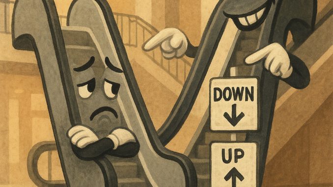 Besonders gefährlich wird es, wenn zwei Rolltreppen sich uneinig sind – dann entsteht eine Zeitfalle: unten rein, oben wieder raus, und doch nie im richtigen Stockwerk.