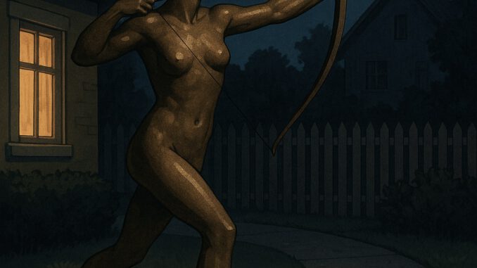 So bleibt ein Rätsel: Wer hat die Bogenschützin geholt, warum, und wohin? Vielleicht taucht sie eines Tages wieder auf – bei Sotheby’s, auf eBay oder einfach im Schuppen von Großpapi, der gerade überlegt, ob sie als Wäscheleine taugt.
