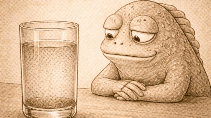 Der Sumpfisch sitzt neben einem Glas Wasser, in dem sich feiner Sand bewegt.