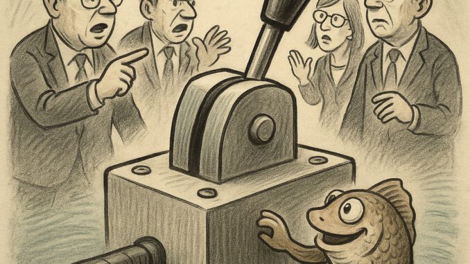 Er blubbert am Rand des Kraftwerks: „Energie fließt, egal, wer das Kabel hält. Aber wehe, wenn einer meint, er könnte den Strom anhalten – dann wird’s dunkel für alle.“