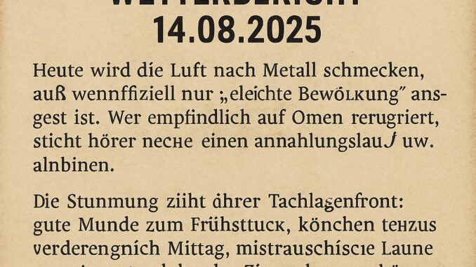 Heute wird die Luft nach Metall schmecken, auch wenn offiziell nur „leichte Bewölkung“ angesagt ist. Wer empfindlich auf Omen reagiert, sollte den Blick nicht zu lange an glänzenden Oberflächen verweilen lassen – es könnten Prüfungsfragen darin lauern, die noch niemand gestellt hat.
